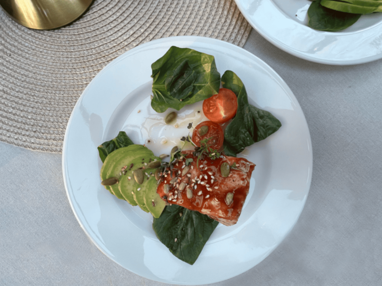 Стейк из лосося с терияки, авокадо, брокколи и шпинатом: стейк средней прожарки, позволяет сохранить полезные свойства продукта и насладиться нежной текстурой рыбы. А традиционный японский соус придает блюду сладко-соленый аромат с нотками пряностей. Его терпкий привкус делает рыбу ещё сочнее и выразительнее на вкус. Мягкая кремовая структура авокадо добавляет свежести и легкости всему блюду. Брокколи, один из фаворитов в качестве гарнира для гостей ресторана привносит свежий травянистый оттенок, а шпинат добавляют зелени и легкую горчинку, создавая контраст вкусов.