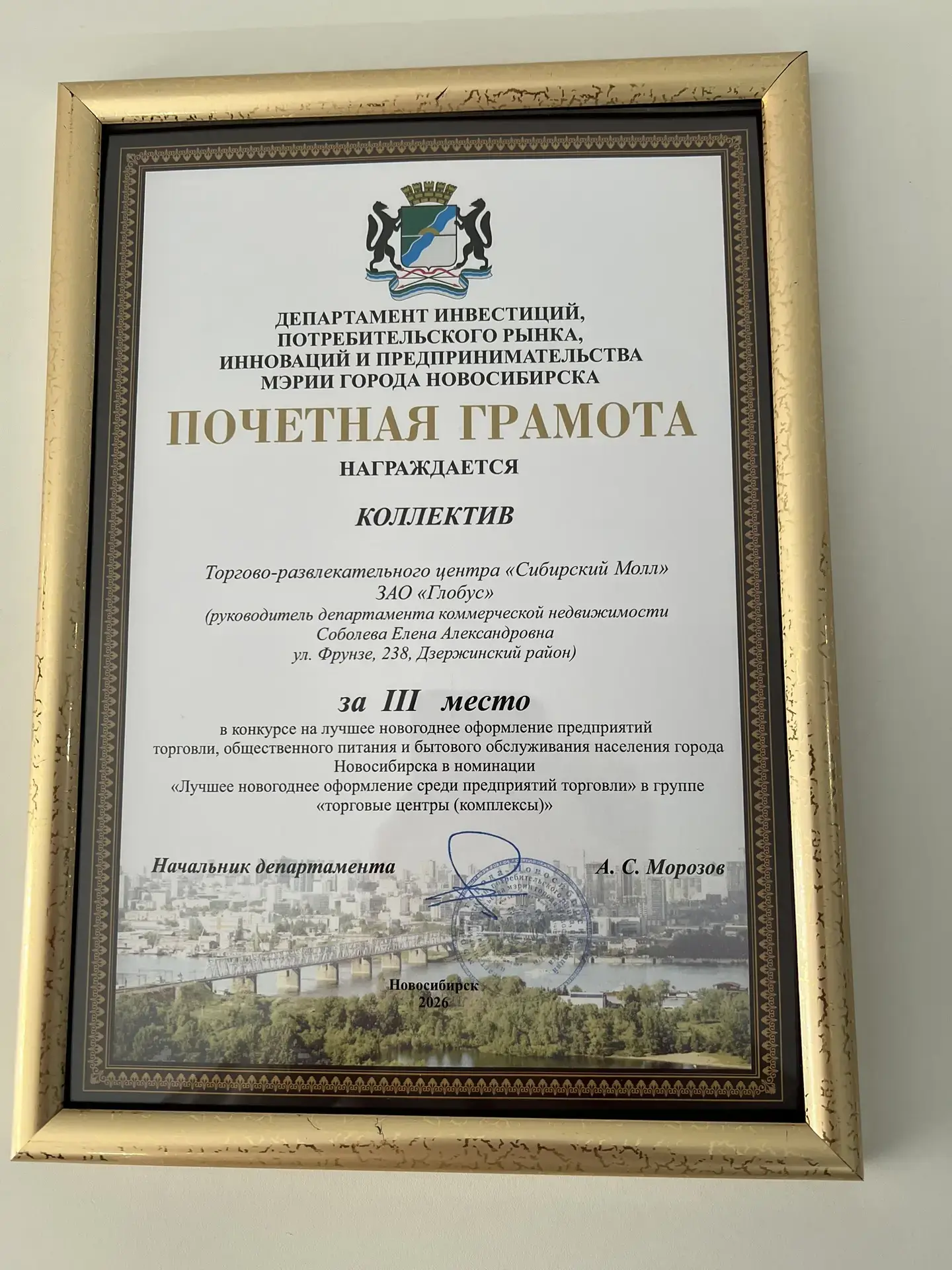 В Новосибирске подвели итоги ежегодного конкурса на лучшее новогоднее оформление и праздничное обслуживание среди предприятий торговли, общественного питания и бытовых услуг. Торговый центр «Сибирский Молл» занял почетное третье место среди ТРЦ, подтвердив высокий уровень подготовки к зимним праздникам.
